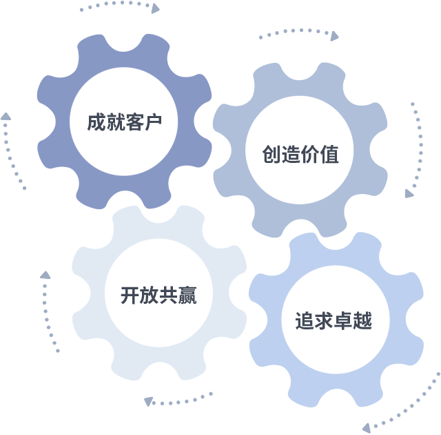 成就客户是一切决策的出发点,,,,创造价值是衡量所有工作的标准,,,,追求卓越是我们做事做人的态度,,,开放共赢是我们的格局也是最终的结果。。。。价值观的齿轮环环相扣,,,推动着组织里的每个人不断向前。。。
